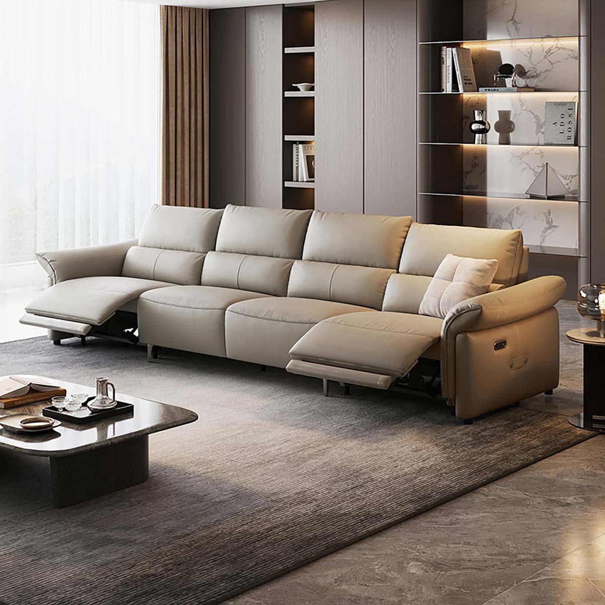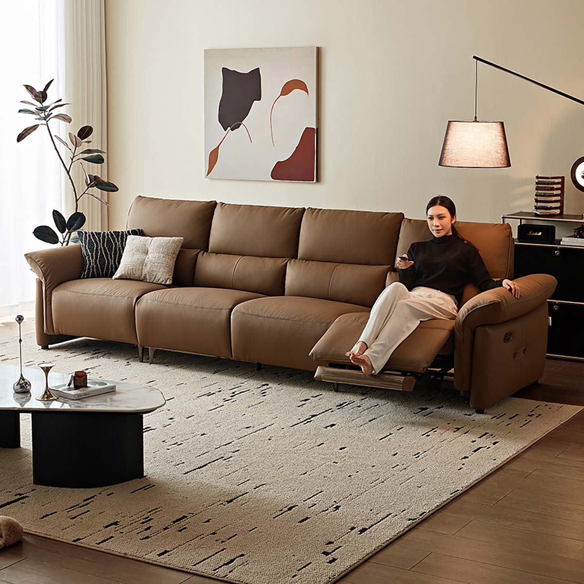 Une simple pression sur le bouton permet de démarrer et d'arrêter facilement le canapé, pour un réglage aisé des positions. Le verrouillage enfant intégré empêche toute utilisation accidentelle, ce qui en fait un choix sûr pour les familles avec de jeunes enfants. Le canapé est revêtu de cuir pleine fleur de haute qualité sur toute l'assise, garantissant une allure et un toucher haut de gamme dans les moindres détails.